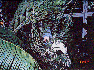 Beth is ready to pounce like a cat from hiding in the plant house. |